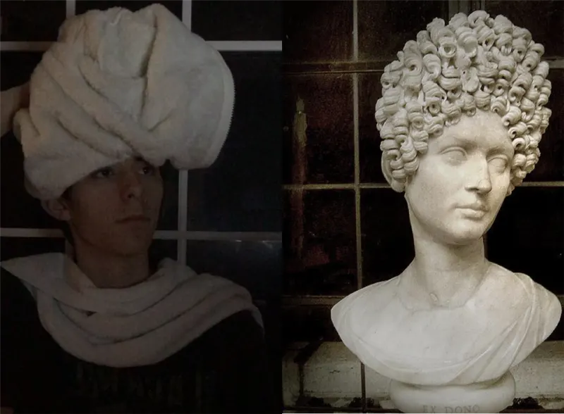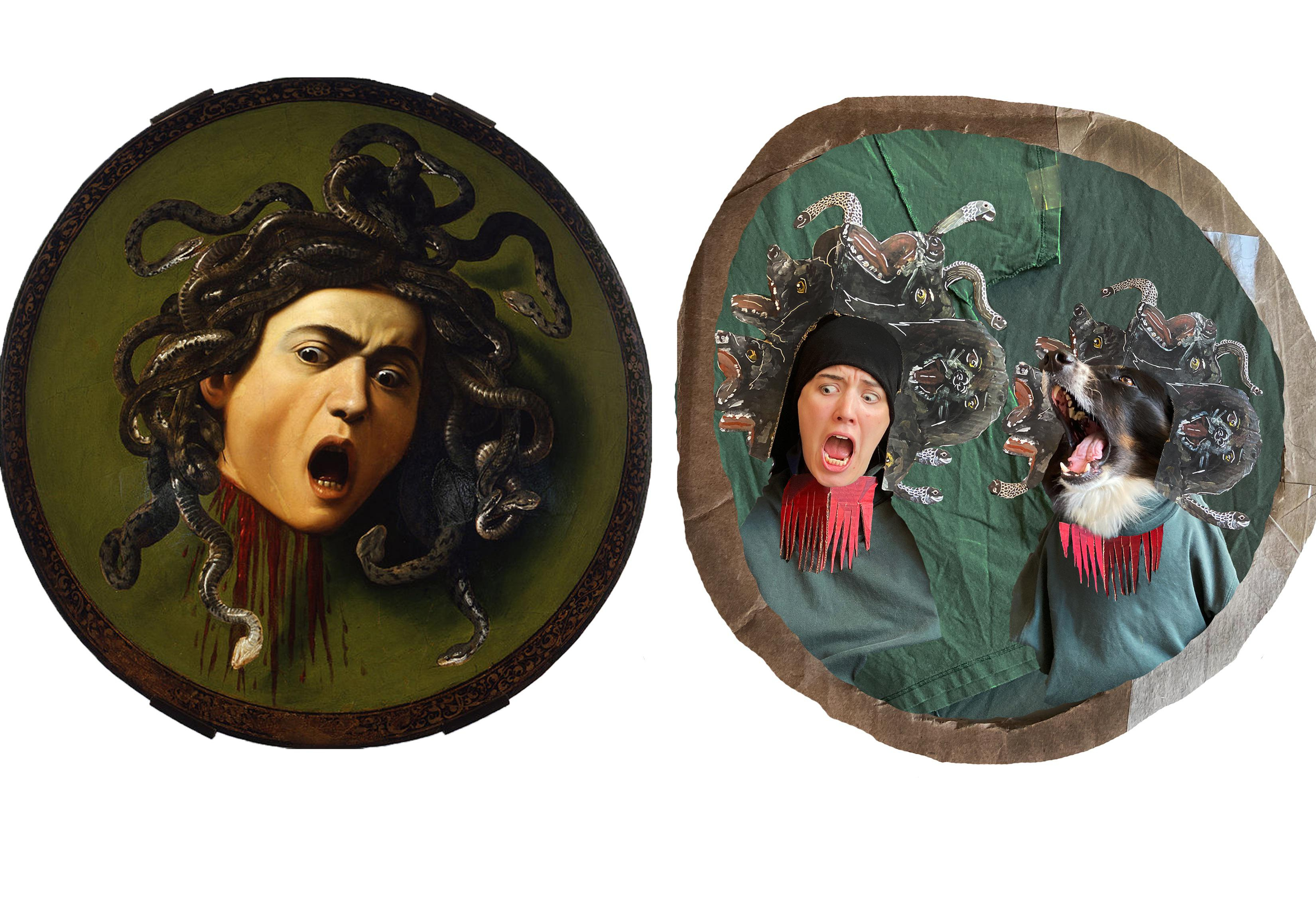 Speaking of Pre-Raphealites, here’s Circe Invidiosa by John William Waterhouse, recreated by a high school student from New Jersey. One of her teachers made the Getty Challenge into an assignment in the spring of 2020, and the school shared the project online. I have mixed feelings about this. Part of the joy of the Getty Challenge is its spontaneity, with people choosing to participate for fun: making students do it for class loses a bit of the magic. On the other hand, this is an offbeat and clever way to get teenagers to approach art history. Judging by the pictures from this school, the assignment encouraged students to think about image composition and lighting, get creative with props, and look at art pieces in an unusual way. Some of the students took their recreations in a gleefully silly direction, like this towel-based Roman bust: