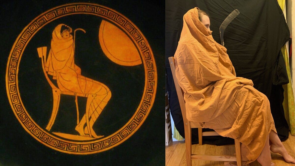 The image of grumpy Achilles bundled in blankets is a common theme in ancient Greek artwork, so I had plenty of images to choose from. I settled on a vase painting, partly because I love them, partly because their minimalist colour scheme was interesting to recreate with objects around my family home. My own body is front and centre in my image, but the scene also incorporates a chair, a bedsheet, and one of my brother’s old hockey sticks. The backdrop is made out of a cape from an old Halloween costume, which I set up using tape and safety pins.