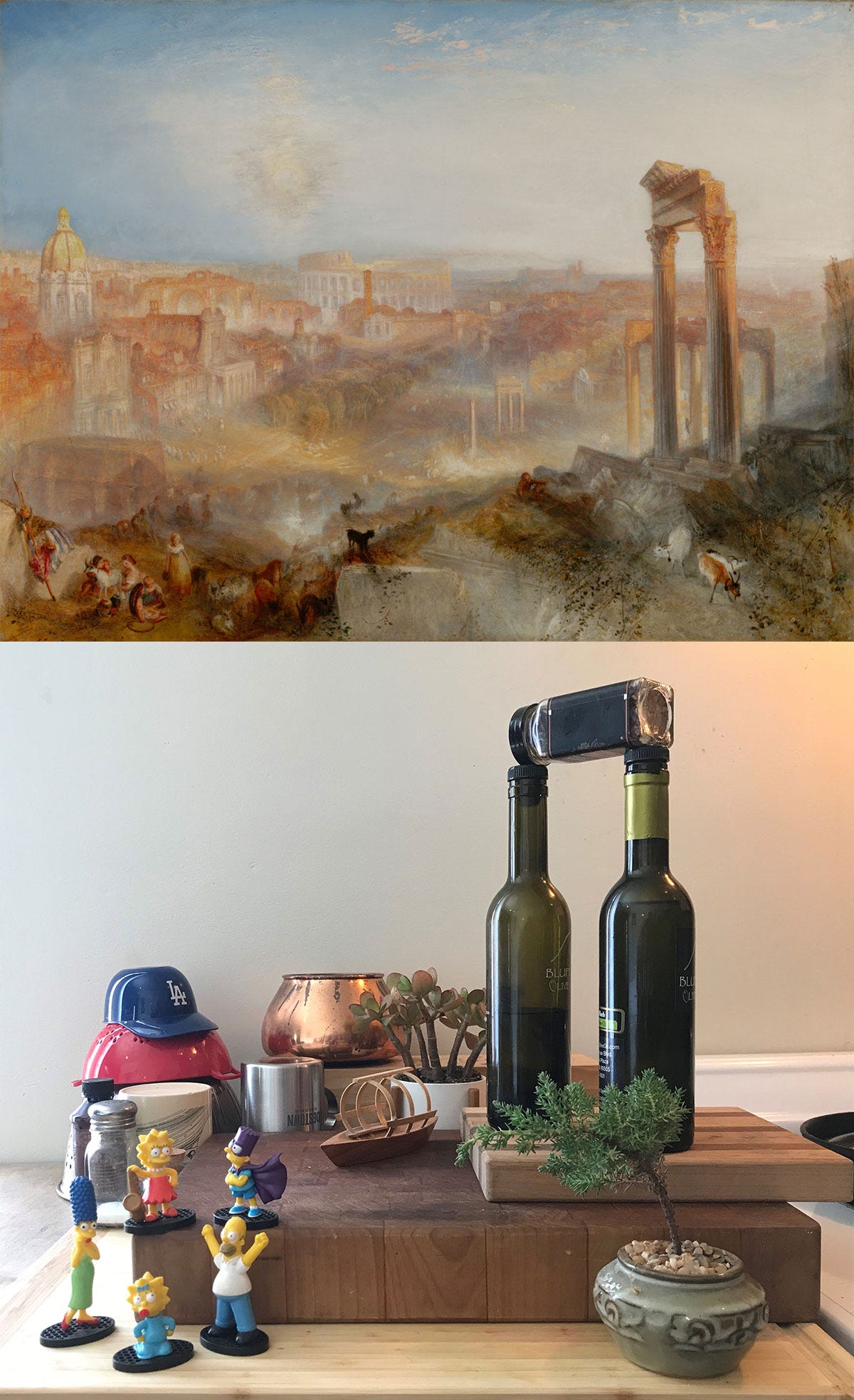 The original March 25th tweet suggested that participants use at least 3 household objects to make their recreations. However, as you’ll soon see, challenge entries quickly got more and more elaborate. The museum’s staff posted a few sample pictures, like the found-object version of JMW Turner’s “Modern Rome” above, but the general social-media-using public got the idea right away. Soon, the Internet was teeming with these household art copies.