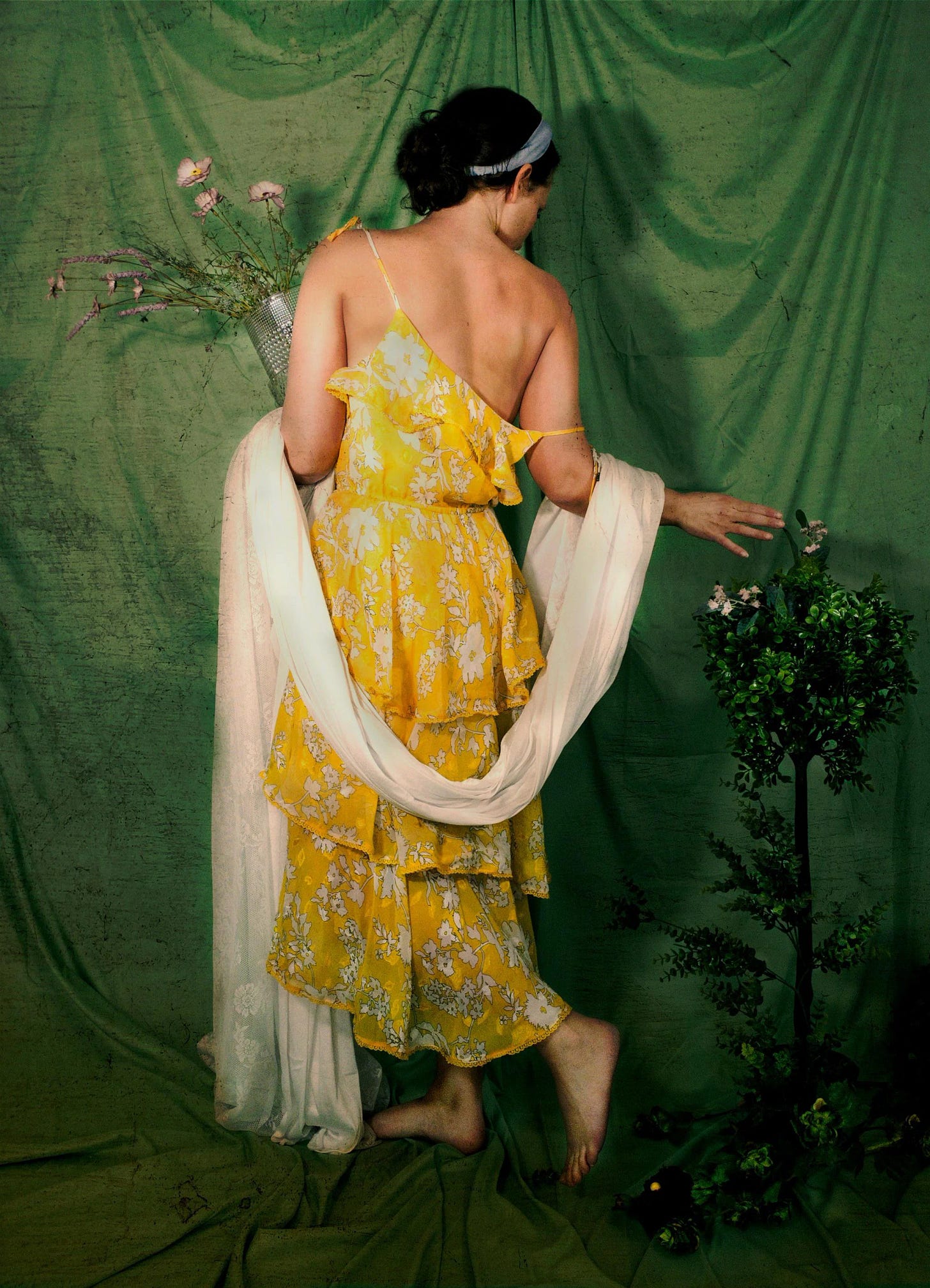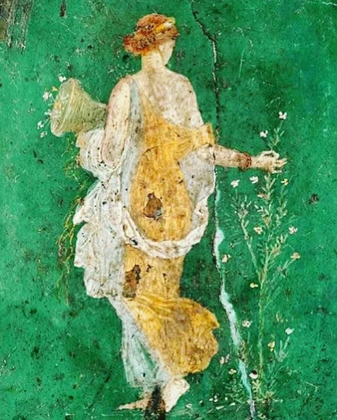 “Woman Picking Flowers” is a 1st century CE fresco from a house in Pompeii. Telma Har’s recreation is a photo from 2021. Her artistic pose and prop choices remind me of later engagement with ancient imagery, especially post-ancient takes on Greek and Roman femininity. Har could pass for a Pre-Raphaelite painter’s model, or part of a Victorian tableau vivant. The plastic bush adds just a little touch of kitsch.